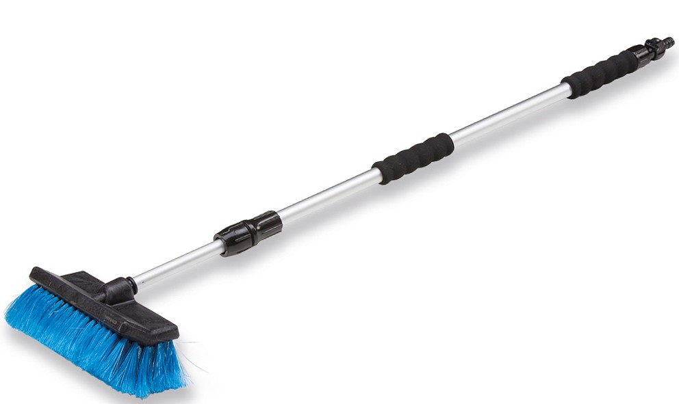 A escova de lavagem com cabo ajustável da Camco para autocaravanas ajusta-se de 109 cm a um tamanho de 180 cm de comprimento. O interruptor ON/OFF (ligado/desligado) integrado garante controlo total sobre a água. Esta escova versátil incorpora uma cabeça de limpeza de 27,9 cm de largura com dois tipos de cerdas para uma maior potência de limpeza: as cerdas brancas levantam a sujidade e as cerdas cinzentas a retiram.